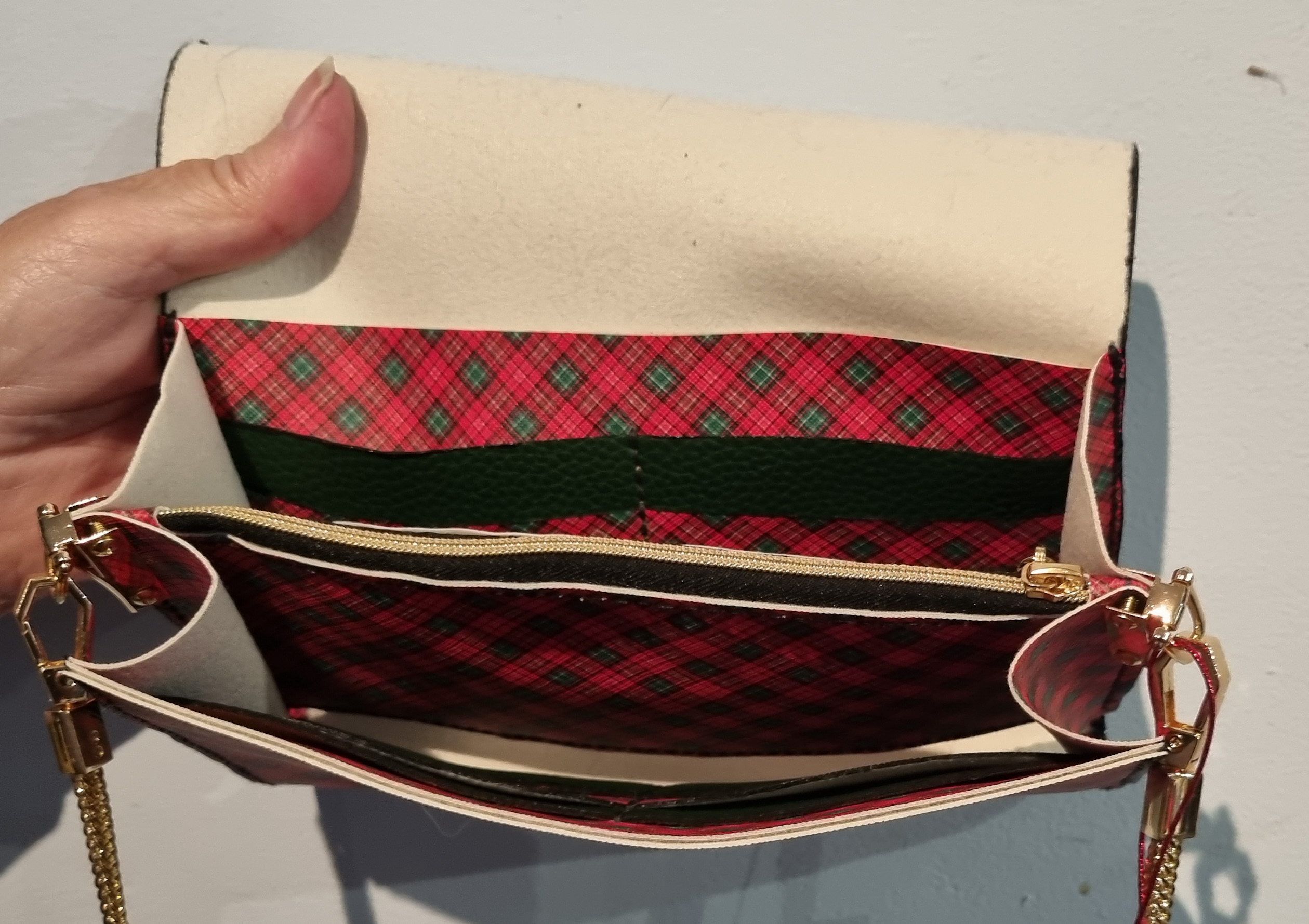 A versatile and so useful plaid clutch purse, this 14cm by 10cm by 3cm deep clutch bag has gold hardware. The hardware includes a 120cm long detachable snake chain, a gold-toothed zip section with a cute tassel zip pull.